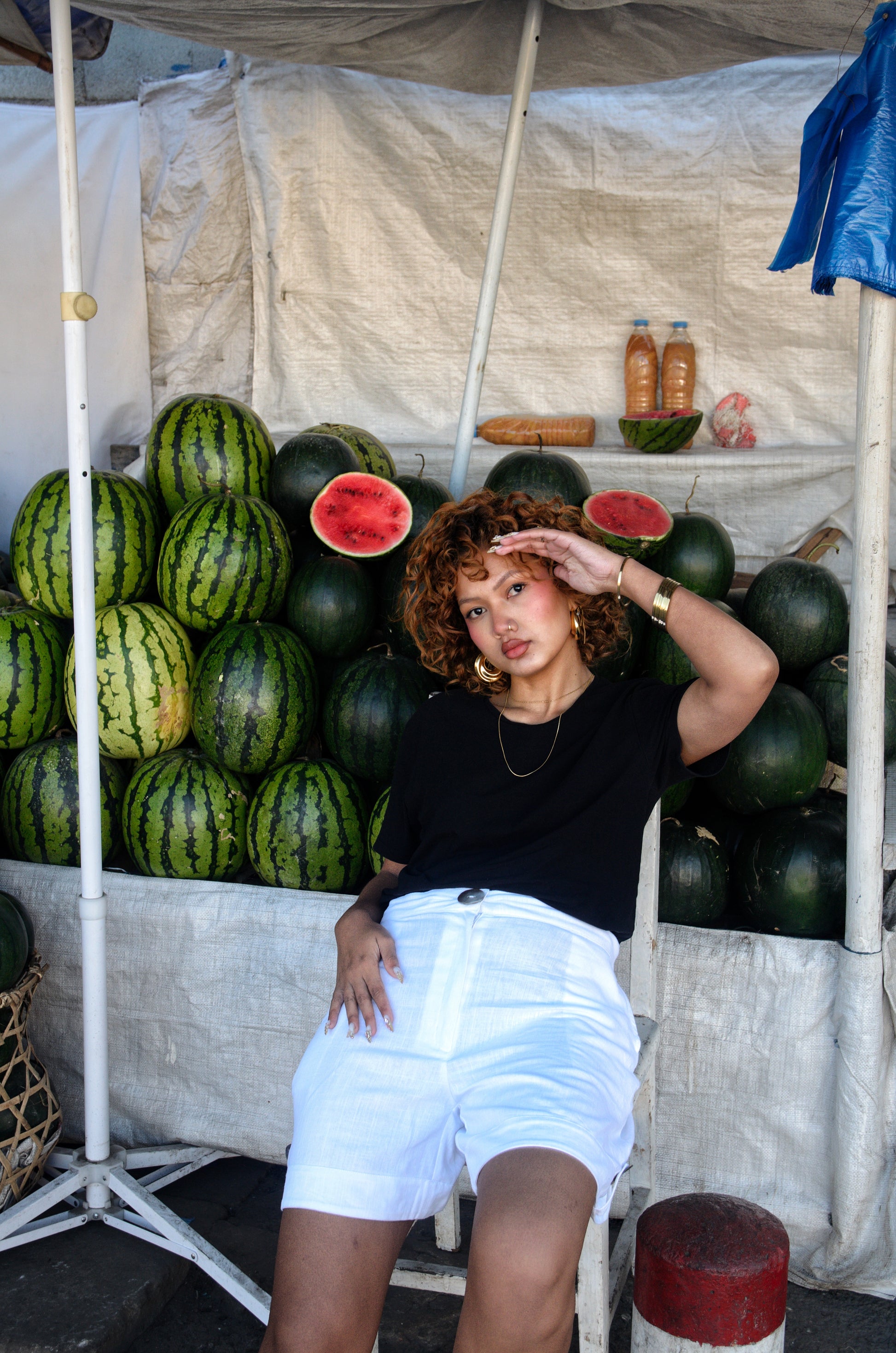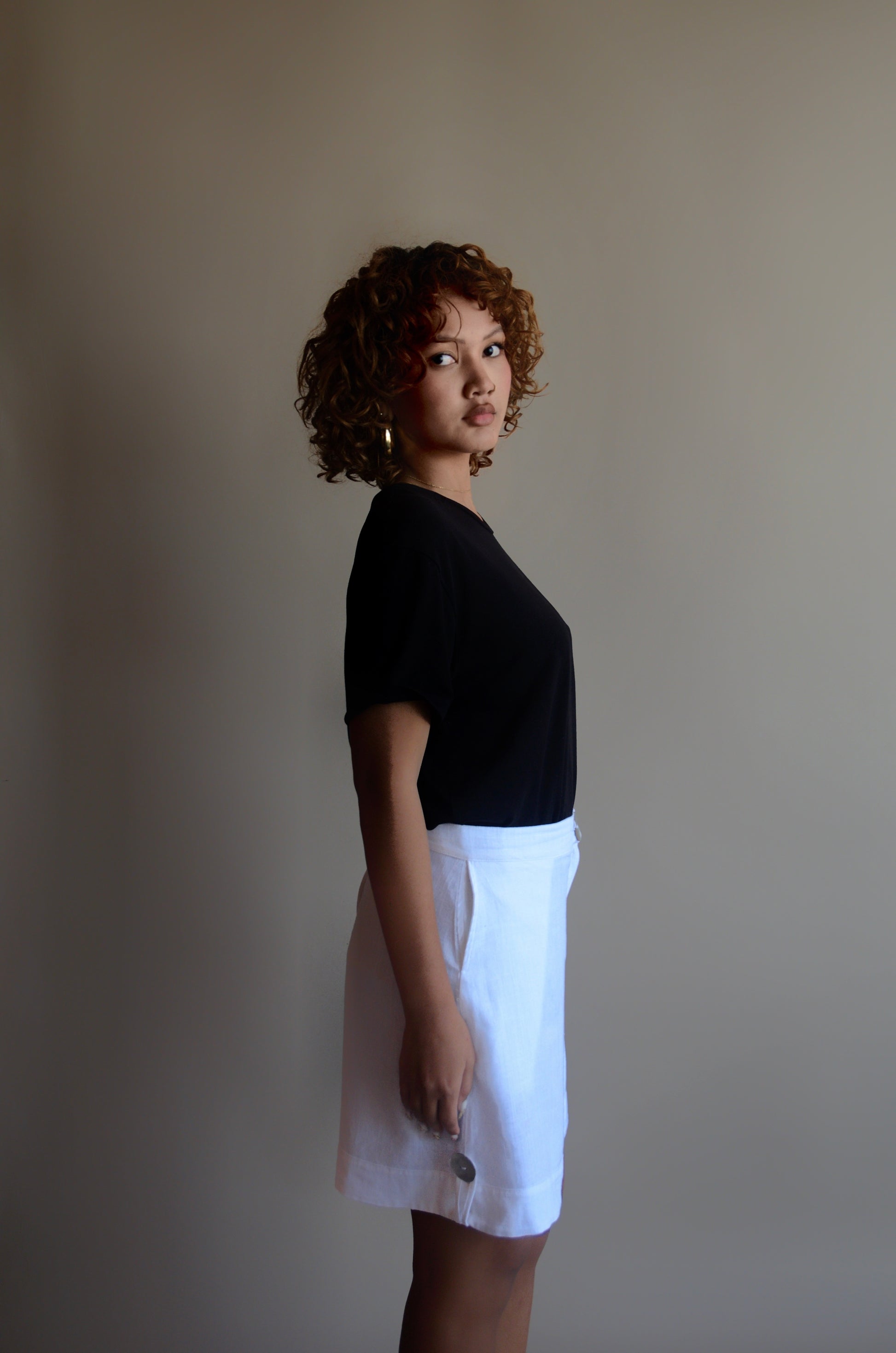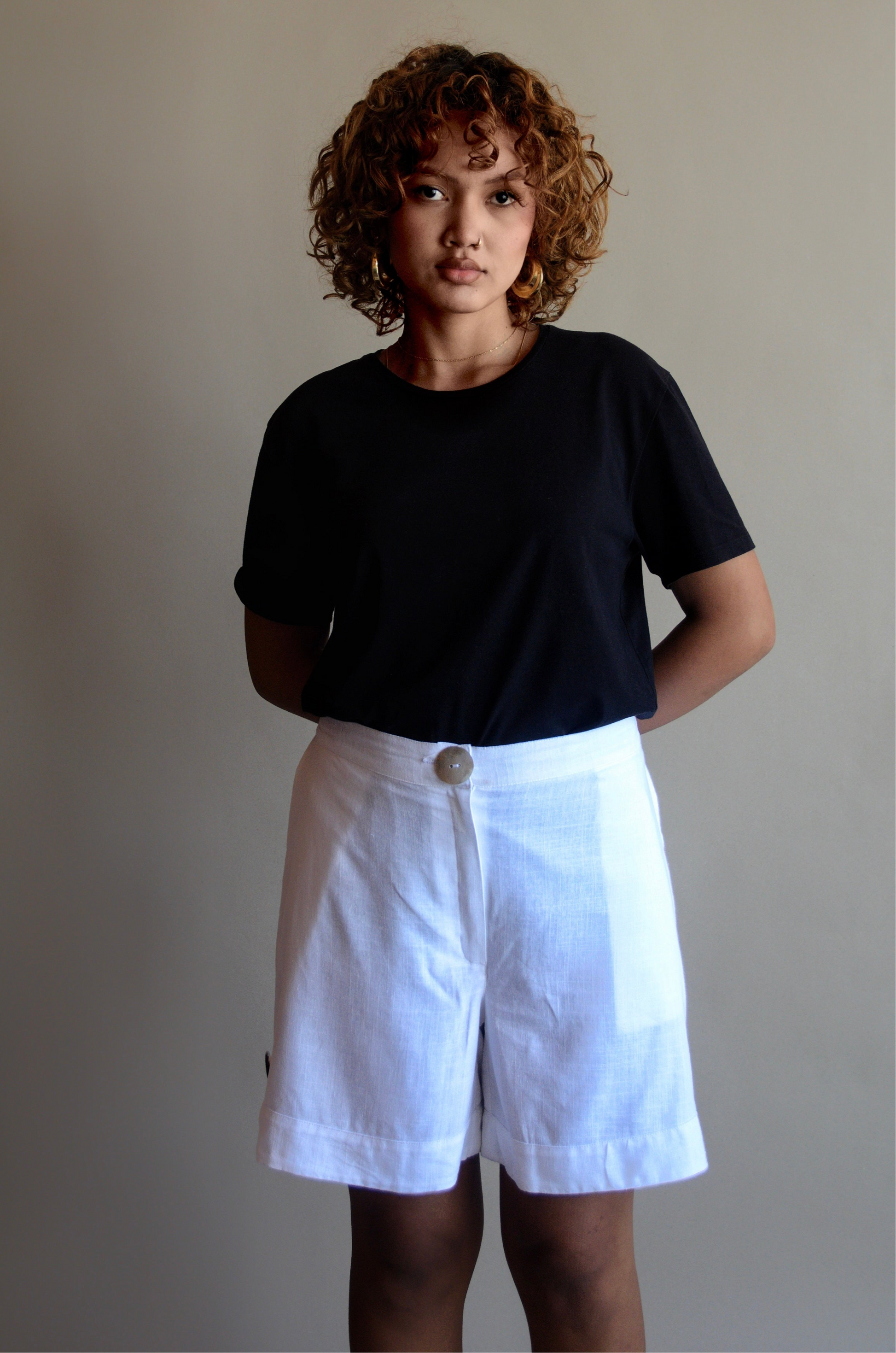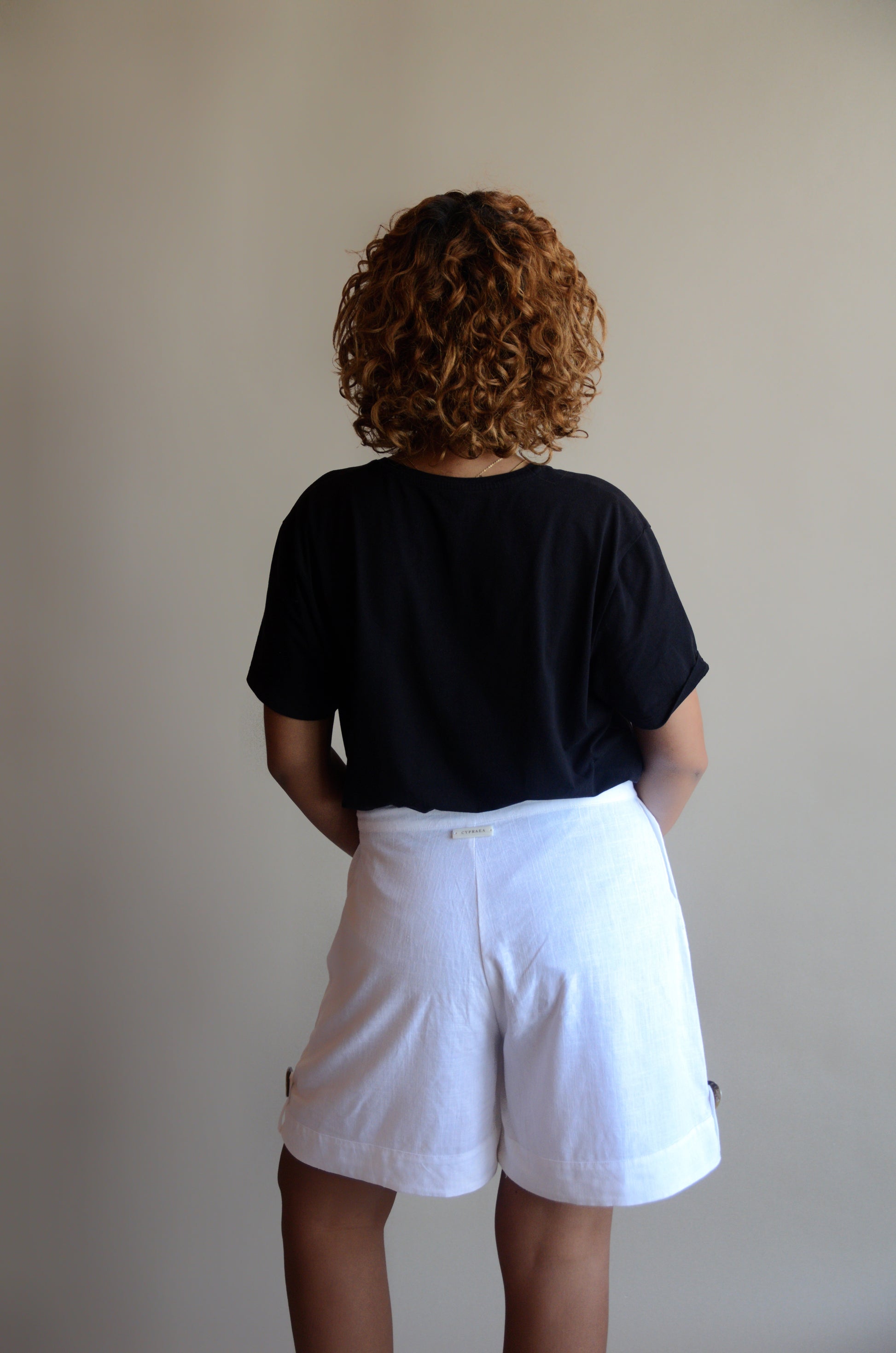 Bermuda en 100% lin, coupe droite, taille haute, accessoirisé de boutons en nacre.