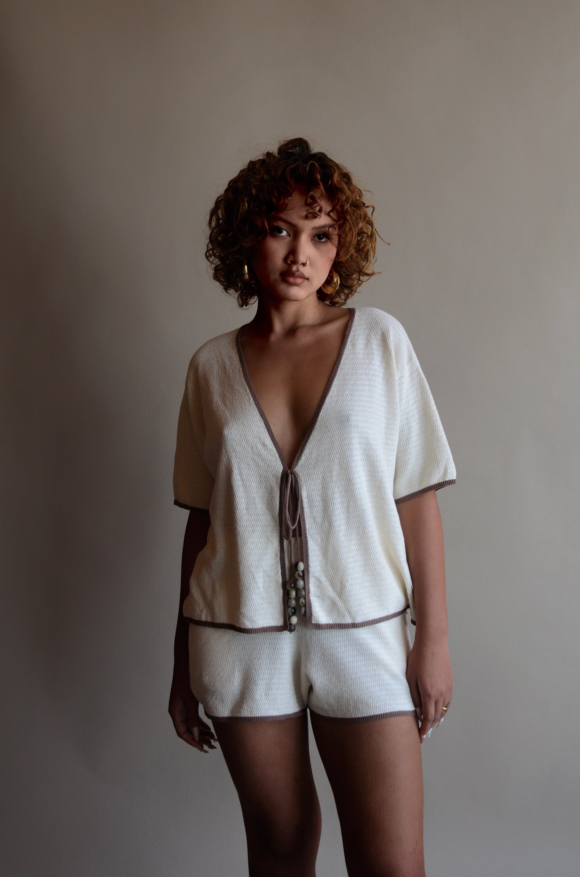 Ensemble en mailles de coton composé d’un short court et d’un haut oversize.