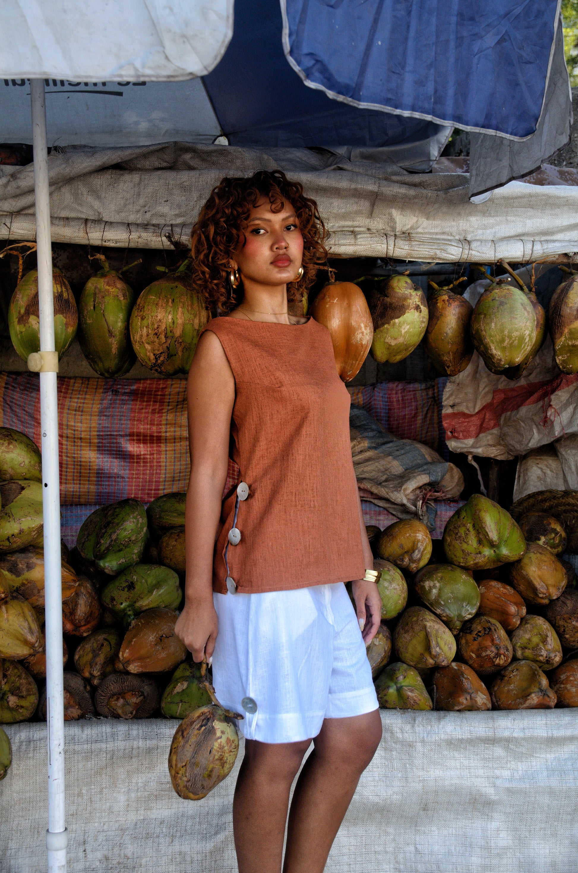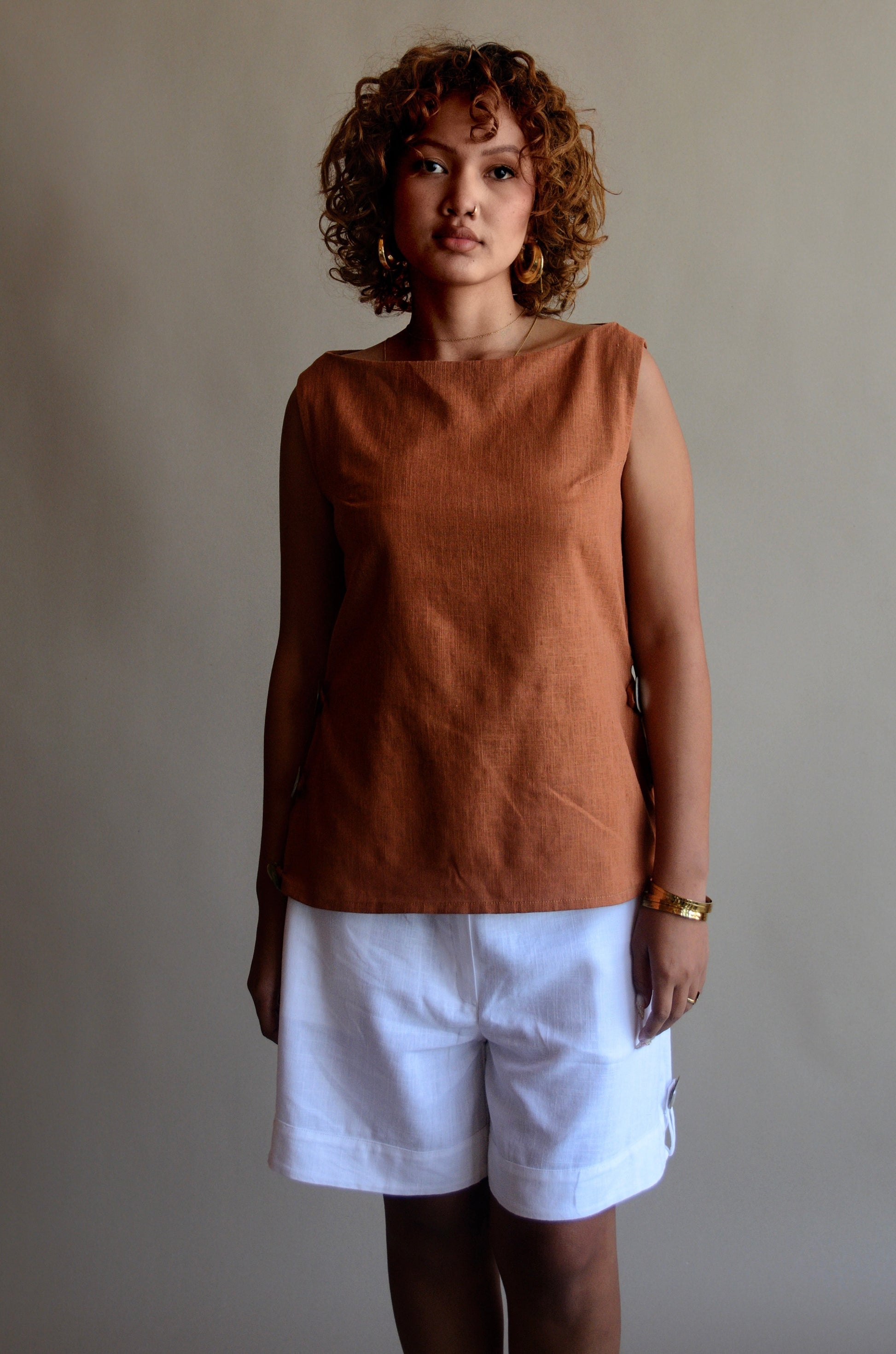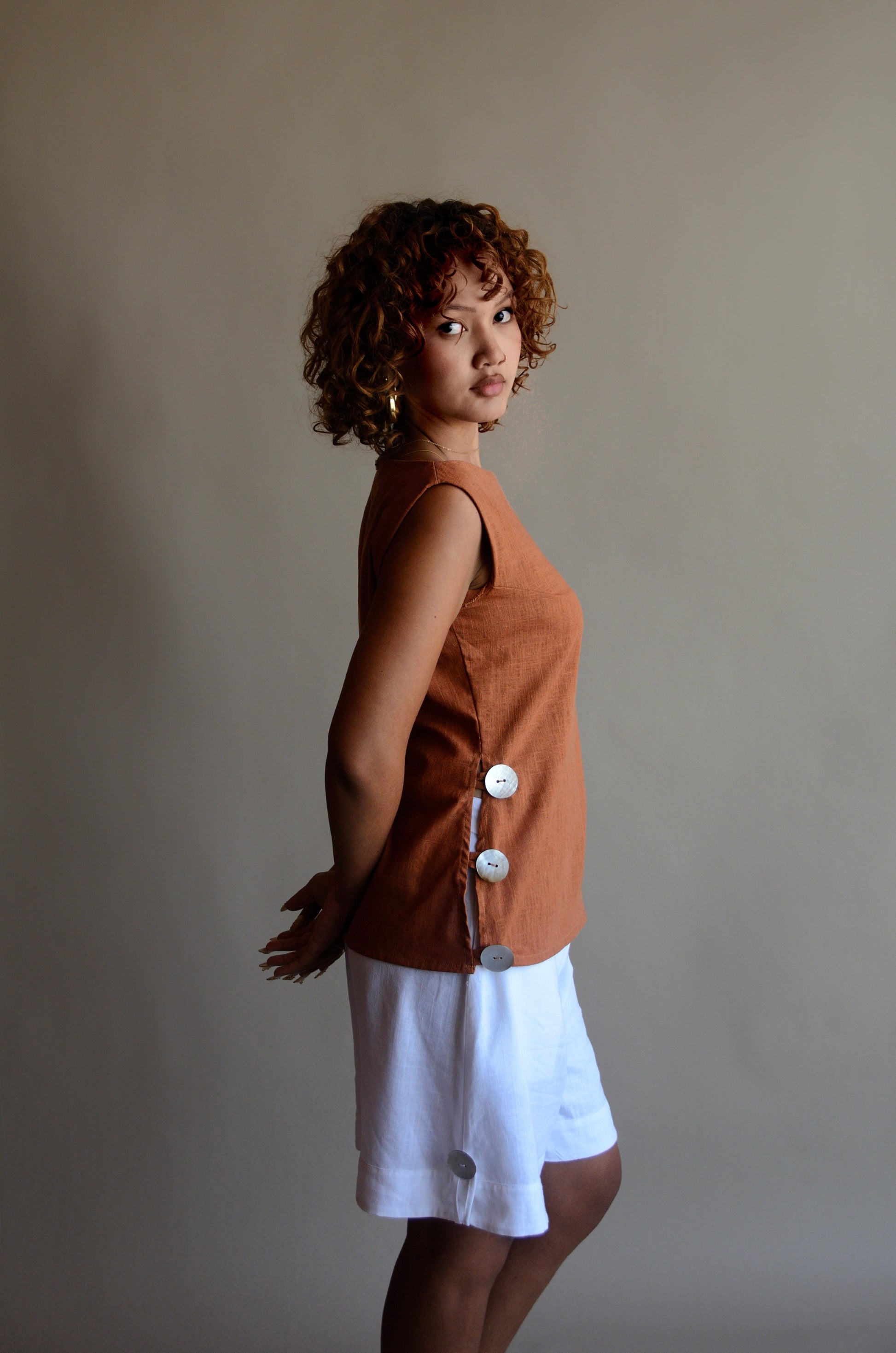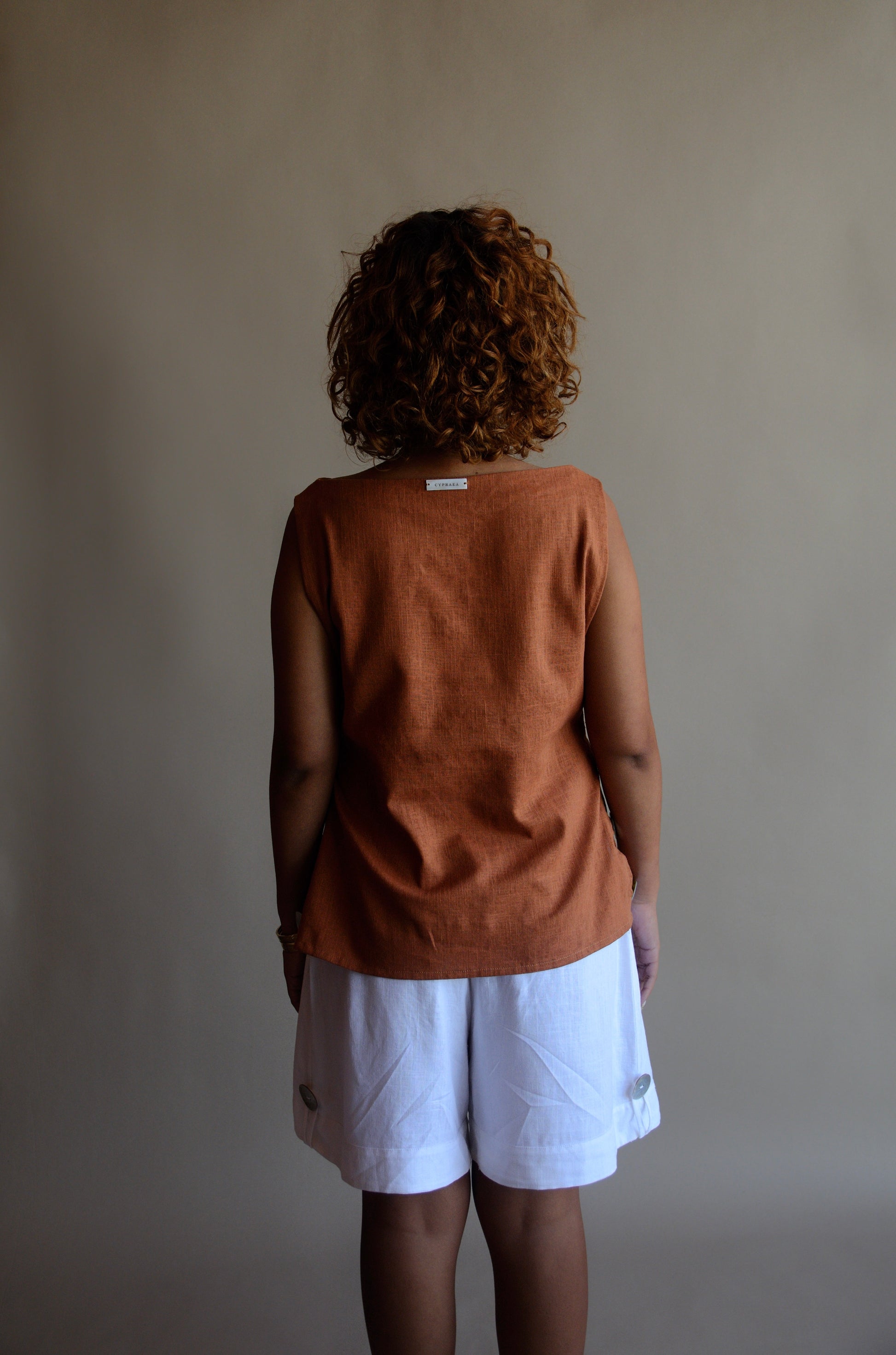 Haut sans manche en 100% lin, col rond, accessoirisé de boutons en nacre.