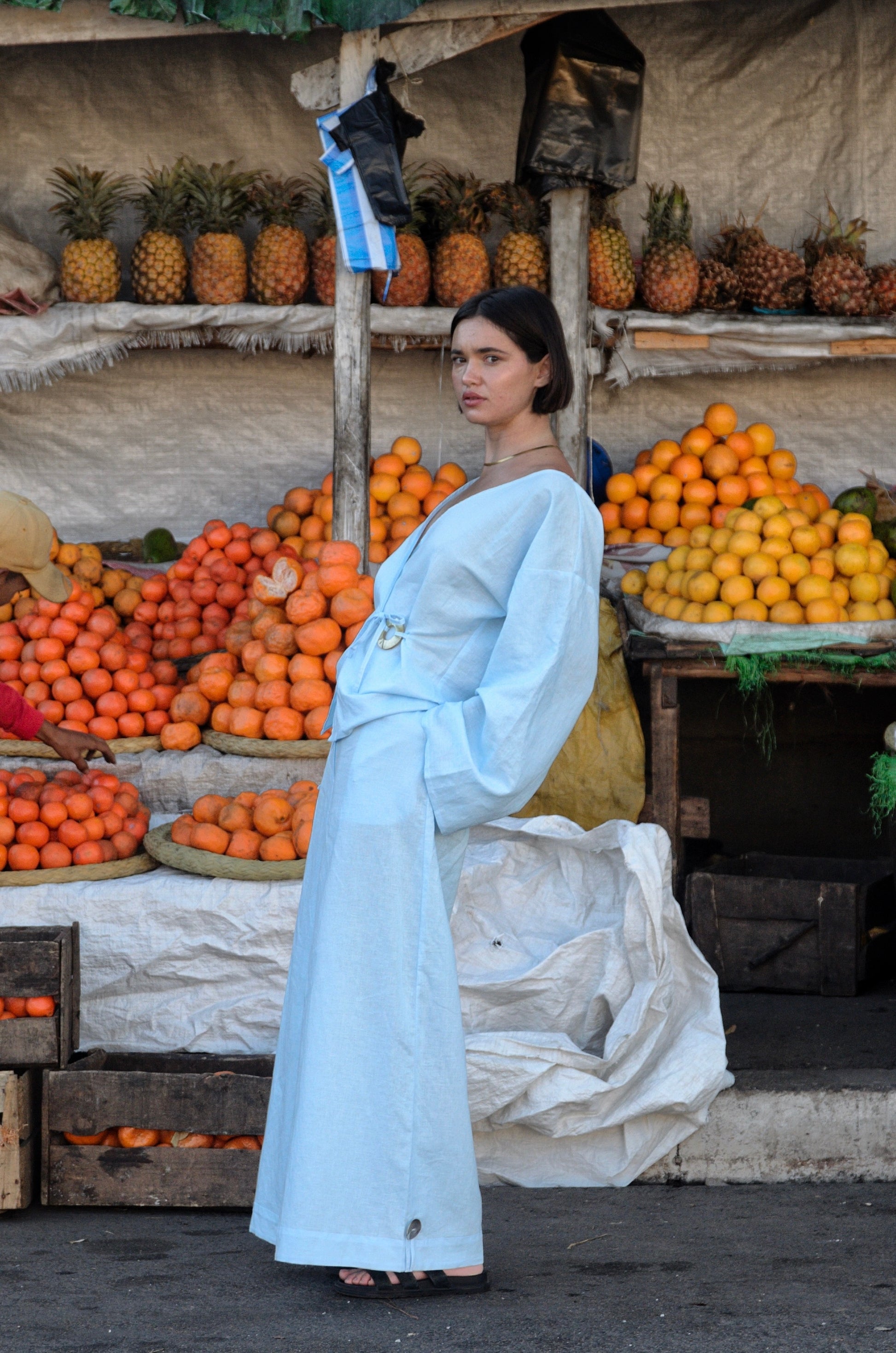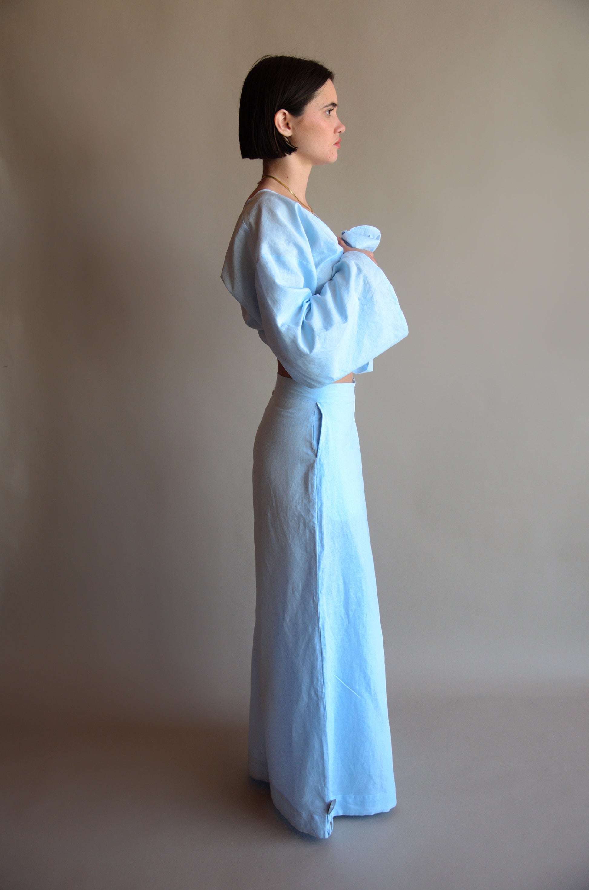 Pantalon en 100% lin, coupe droite et taille haute, accessoirisé par des boutons en nacre.